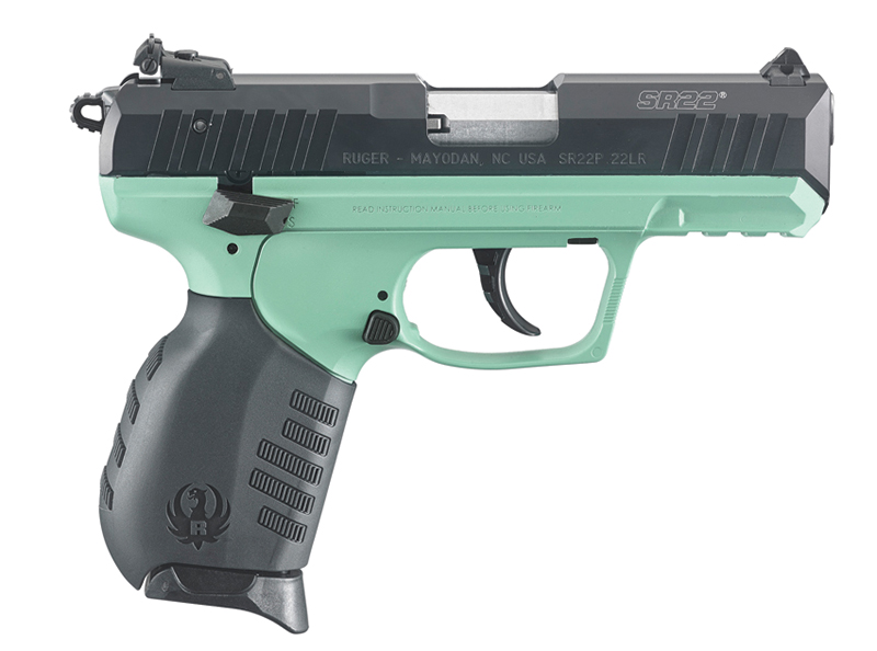 The Ruger SR22 22LR TALO Exclusive Turquoise pistol is a semi automatic single or double action pistol. It is a great platform for training new shooters, or just to go out and have some fun cheap target practice. Designed with a polymer frame and two interchangeable rubberized grips the SR22 can be adjusted to the shooters preference. The light double action, and crips single action trigger pull coupled with the rubberized grips and magazine finger grip extensions. Make the Ruger SR22 22LR, one very easy and ergonomic pistol to shoot.